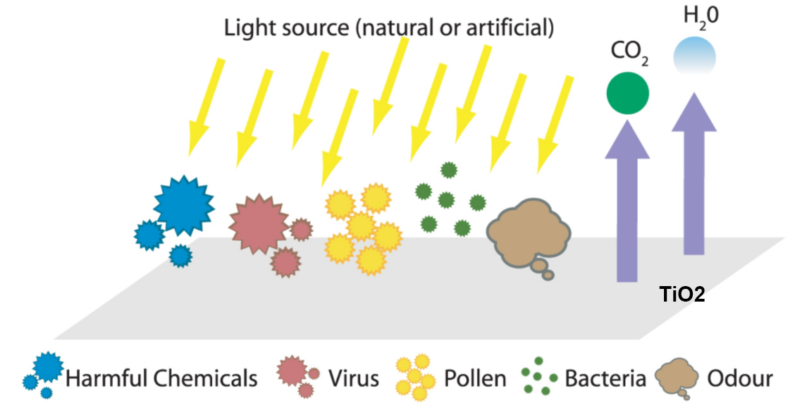 Titanium Dioxide (TiO2) is een veel voorkomende grondstof op het aardoppervlak en genereert sterk antimicrobieel en zelfreinigend effect door in contact te komen met UV-licht tot 475nm. Titanium Dioxide is een halfgeleider die in contact met licht elektronen en elektronengaten genereert. Vervolgens reageert het met water en zuurstof om hydroxylradicalen en reactieve zuurstof te genereren als kataysator. Er ontstaat een elektromagnetische reactie (kortsluiting), waarbij de aanwezige verbintenissen als; micro-organismen, vuil, VOG's worden afgebroken zonder schadelijke gevolgen voor de gezondheid en milieu.