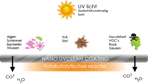 UV bescherming: doordat de coating wordt geactiveerd door UV-licht en de energie van UV omzet in hydroxiel radicalen, voorkomt het dat oppervlakten UV doorlatend zijn of worden aangetast (verkleuring).